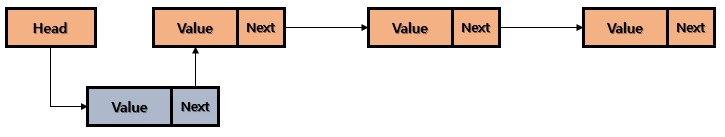 다음 그림과 같이 새로운 노드를 추가하고 Next를 기존 head가 가리키고 있는 부분으로 지칭합니다. 그런 후 Head가 가르키고 있는 부분을 새로 생성한 부분으로 놓습니다.