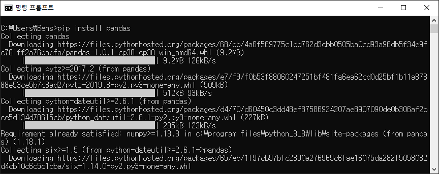 이와 같은 방식으로 pip를 이용해서 쉽게 Pandas를 설치할 수 있습니다.