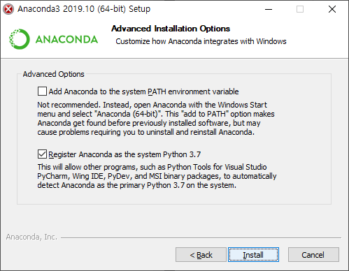 다음의 설정에 관련된 부분입니다. 즉 아나콘다(Anaconda) 자체를 환경 변수로 등록해서 사용할 것인지 관련된 툴에서 자동 검출해서 연동해서 사용할 것인지에 대한 설정입니다. 둘 다 상관은 없지만, 2번째 것이 훨씬 사용하시는 데에 편리하고 정신건강에도 좋을 수 있습니다.