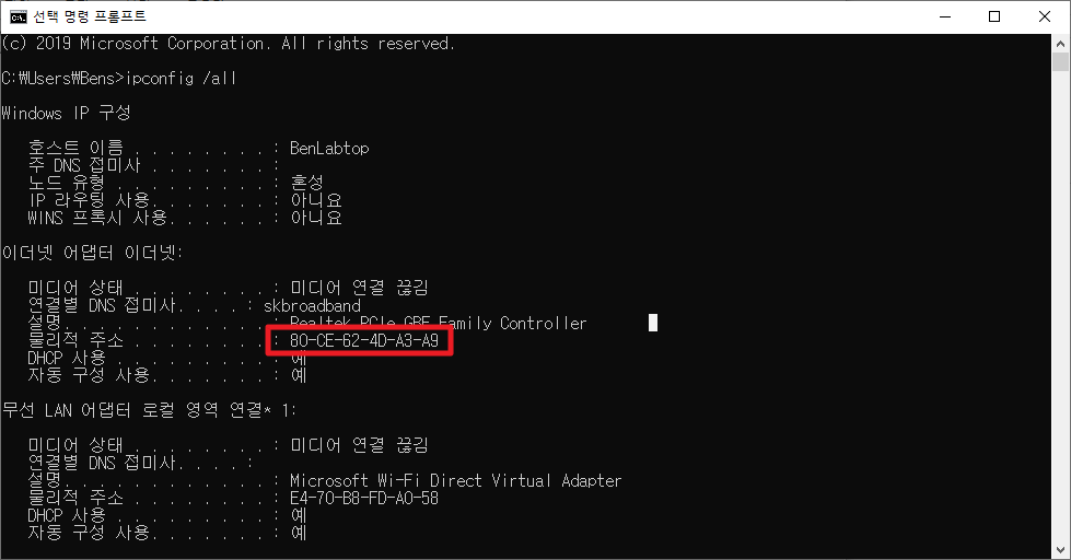 그런 후 다시 한번 ipconfig /all를 바탕으로 살펴보시면 최초에 보이는 Mac Address와 변경 되어 있는 것을 확인할 수 있을 것입니다.