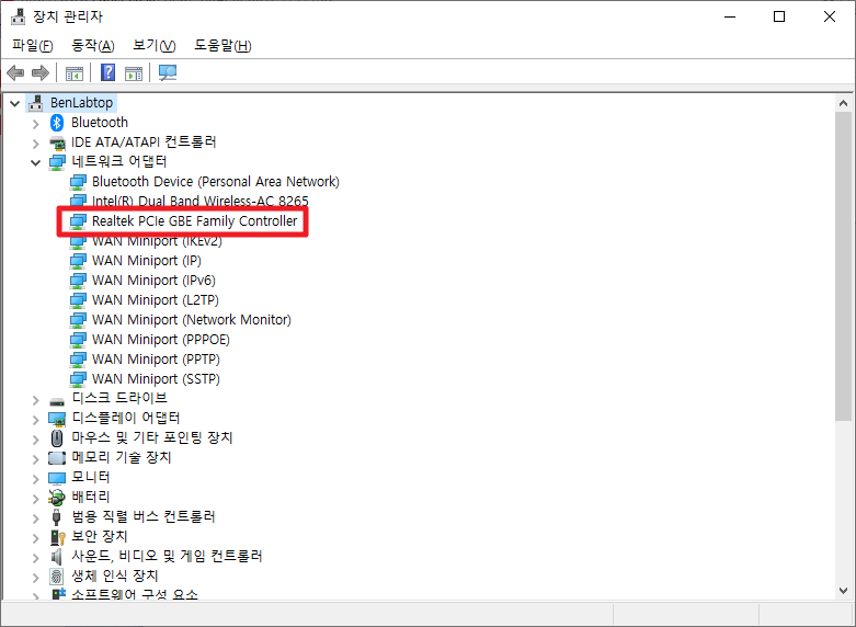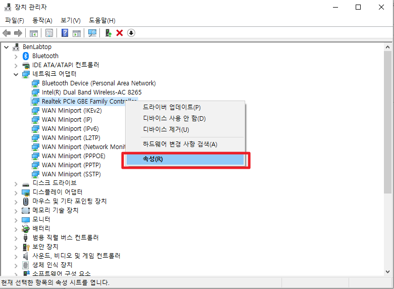 장치 관리자를 실행시키시면, 다음과 같이 많은 메뉴들이 나타날 것입니다. 여기에서 Mac Address의 경우는 네트워크 관련이기 떄문에 네트워크 어댑터의 포함된 부분들을 활성화 시켜주시길 바랍니다. 여기에서 본인이 원하시는 네트워크 어댑터를 선택해주시길 바랍니다. 대부분의 Wifi 및 다른 포트들은 막혀 있는 경우가 많습니다. (이럴 경우 아래 설명되어 있는 Software를 이용한 변경 이용 권장) 그래서 대부분 이더넷 어댑터를 변경하는 경우가 많습니다. 원하시는 어댑터를 선택하시고 우측 버튼을 눌러주시길 바랍니다.
