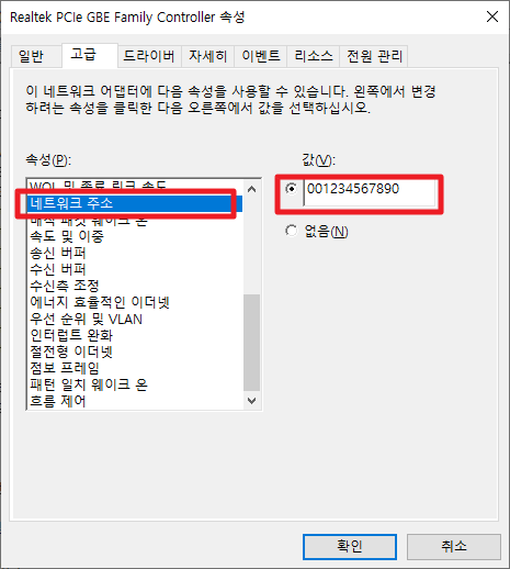 그럼 속성 메뉴가 나올 것입니다. 우선, 상단에 보이는 탭중에 [고급] 탭을 클릭해주시길 바랍니다. 그런 후에 [네트워크 주소]를 선택해 주시고 변경 원하시는 값을 입력해주세요. (12입력) 입력 하신 후 확인 버튼을 눌러 주시길 바랍니다.