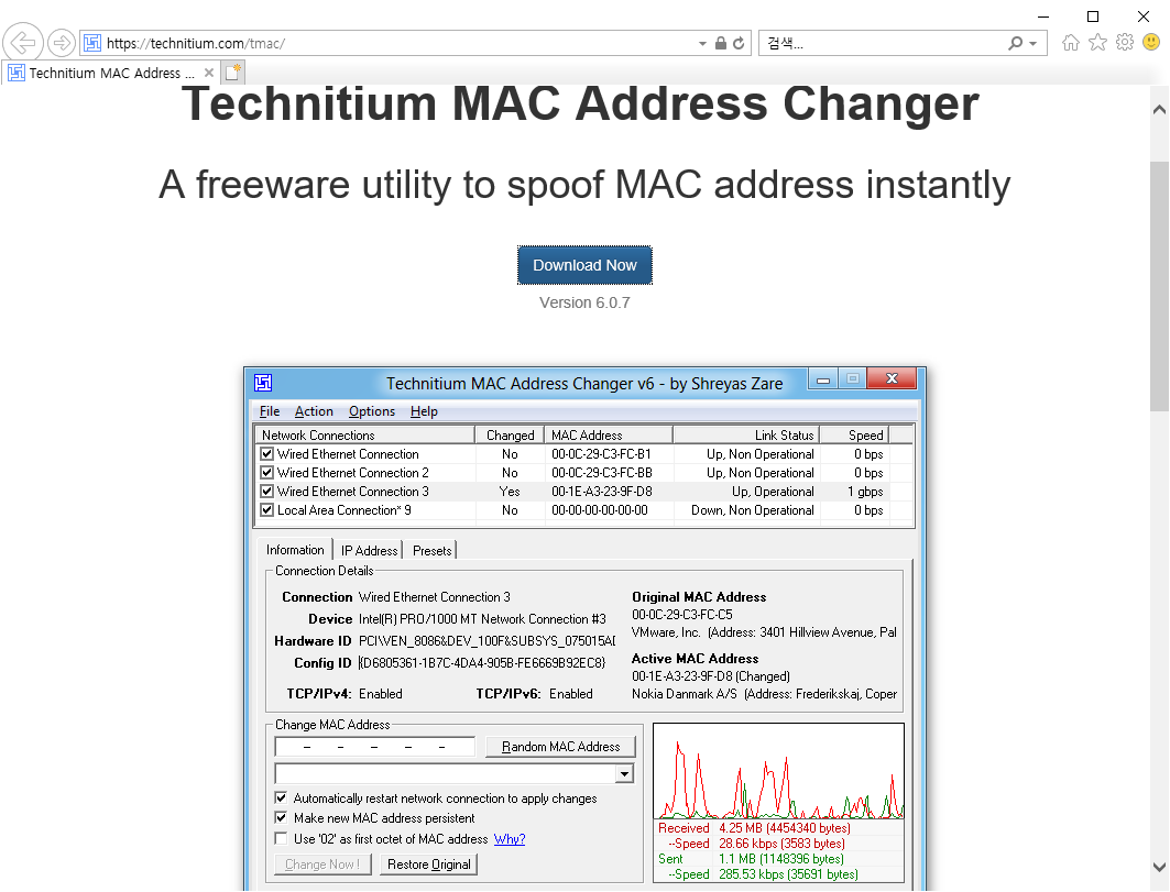 저의 경우는 Technitium MAC Address Changer를 자주 애용합니다. 그 이유는 Freeware라서 회사나, 개인이 아무런 제약 없이 편하게 사용할 수 있기 때문입니다. 그럼 다음 사이트를 이용하셔서 다운로드가 가능합니다.