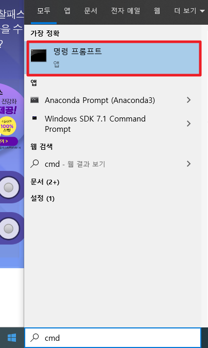 먼저, 윈도우 키를 누르시고, Cmd 버튼을 눌러서 명령 프롬프트 앱을 찾아 주세요. 그런 후에 명령 프롬프트를 실행시켜 주시길 바랍니다.