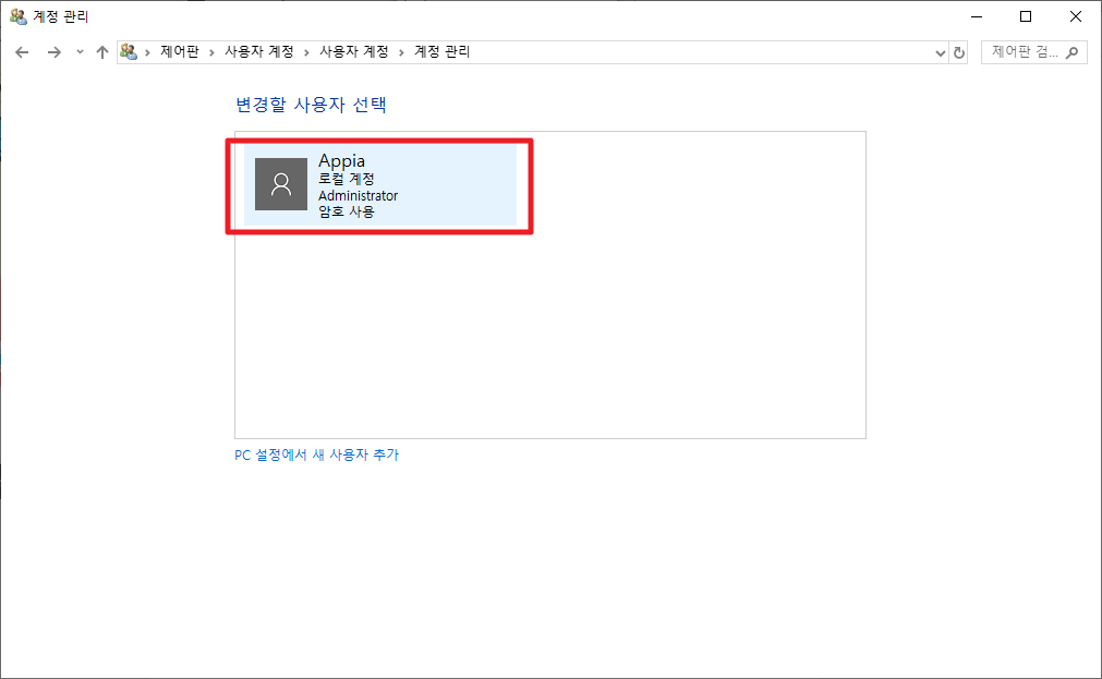 그럼 암호를 없애고자 하시는 계정을 선택해주시길 바랍니다. 저의 경우는 계정이 하나만 등록되어 있는 상태입니다.