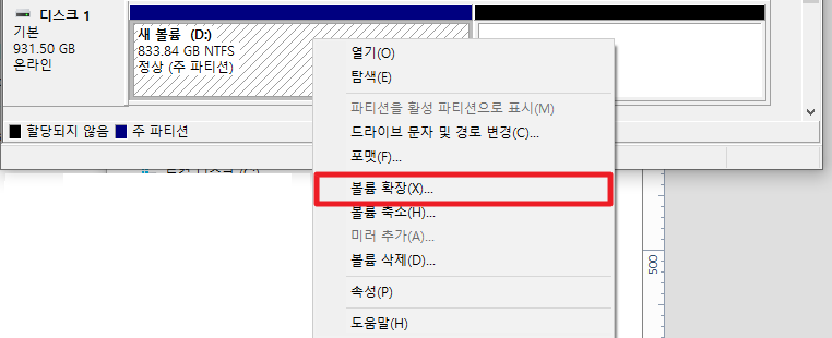 그럼 볼륨이 삭제되었을 것입니다. 그리고 할당되지 않음으로 표시가 되어 있을 것입니다. 현재 디스크에서 사용하고 있는 볼륨에서 마우스 오른쪽 버튼을 눌러주시고 [볼륨 확장]을 클릭해주시길 바랍니다.