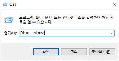 혹은 이게 싫으시면 [윈도우 표시 키 + R]를 누르셔서 실행화면이 뜨시면 [Diskmgmt.msc]를 실행시켜주시길 바랍니다.