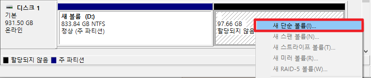 그럼 다음 그림과 같이 기존 디스크에서 저장공간이 931GB -> 833GB로 줄고 할당되지 않은 공간이 나타날 것입니다.