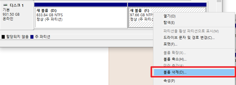 앞서서 파티션을 나누었다면 이번에는 합치는 방법에 대해서 살펴보겠습니다. 그럼 먼저, 다음 그림과 같이 나누어진 하드 디스크의 볼륨을 삭제 해주시길 바랍니다. 먼저, 나누어진 부분에서 오른쪽 버튼을 클릭하시고 [볼륨삭제]를 눌러주시길 바랍니다.