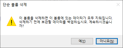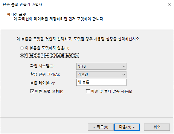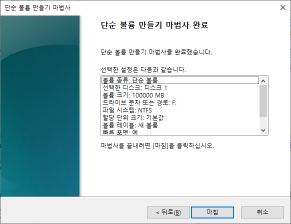 그럼 단순 불륨만들기 마법사가 실행되고, 보이는 메뉴에서 다음 및 확인 버튼을 눌러서 진행해 주시면 됩니다.