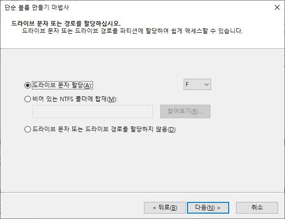 드라이브가 할당되기 원하는 문자를 선택해 주시길 바랍니다. 향후에 변경이 가능하니 그리 크게 신경을 쓰시지 않아도 됩니다.