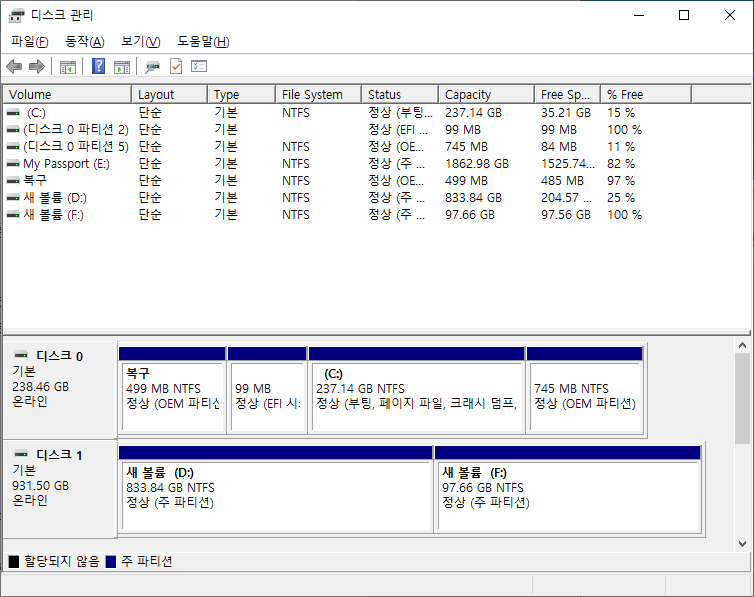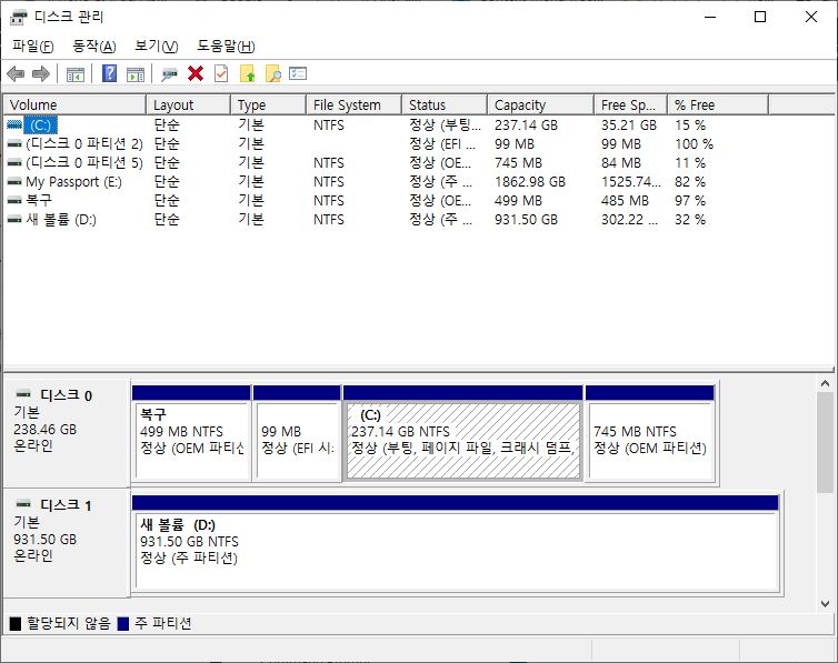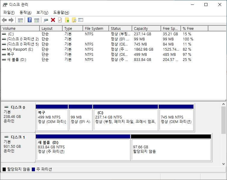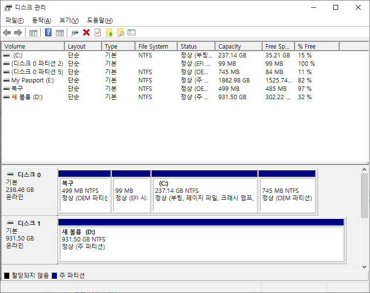 그럼 다음과 같은 화면의 디스크 관리 창이 나타날 것입니다.