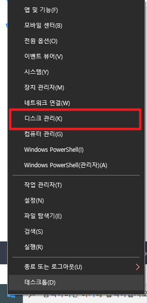 먼저 좌측 가장 하단에 윈도우 표시에서 오른쪽 버튼을 누르시면, 다음과 같은 화면이 나타납니다. 여기에서 [디스크 관린]를 실행시켜 주세요.