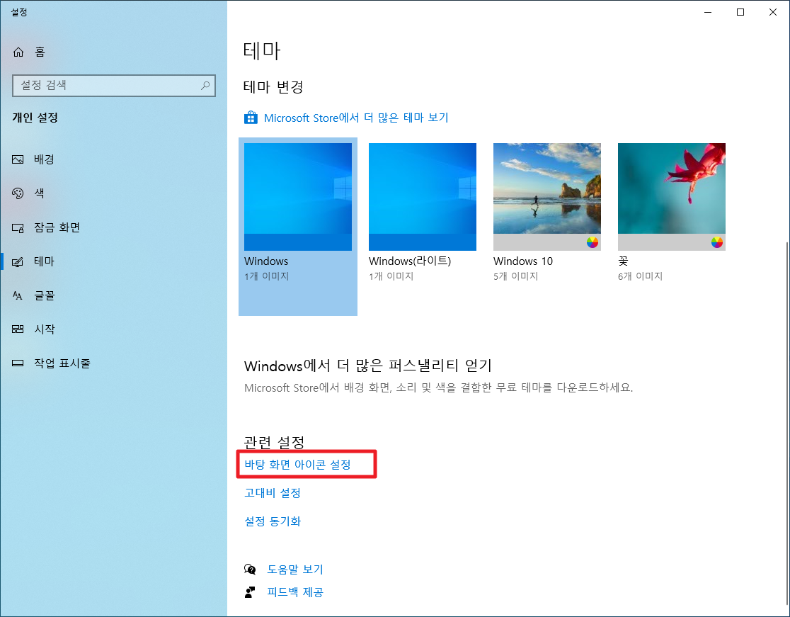 그럼 테마 메뉴가 나타날 것입니다. 여기에서 하단에 [바탕 화면 아이콘 설정]부분을 클릭해 주시길 바랍니다.