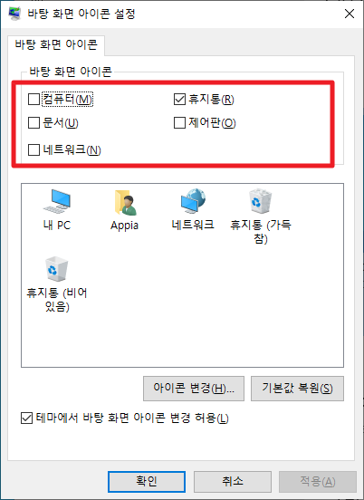그럼 다음과 같이 [바탕 화면 아이콘 설정]이라는 메뉴가 나타날 것입니다. 와~ 여기에는 기존에 윈도우7에서 바탕화면에 표시되었던 아이콘들이 다 보일 것입니다. 이메뉴에서 제가 빨간 상자 표시 한 부분중에 표시하시고자 하는 아이콘들을 선택해 주시면 바탕 화면 상에 표시가 됩니다. 저의 경우 [컴퓨터]를 클릭한 후 확인 버튼을 눌러 보도록 하겠습니다.