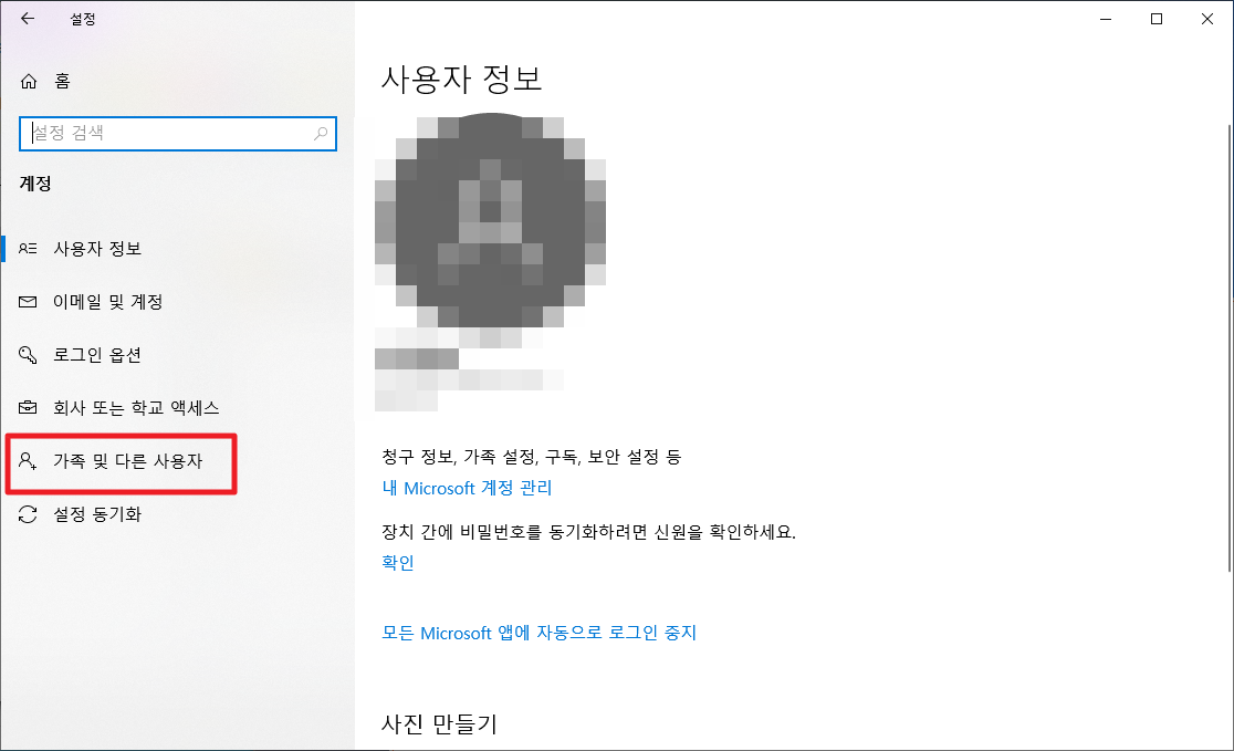 위와 같이 [계정]부분을 클릭해 주시면, 다음과 같이 사용자 정보가 나타날 것입니다. 여기에서 좌측에 보이시는 [가족 및 다른 사용자]부분을 클릭해 주시길 바랍니다.