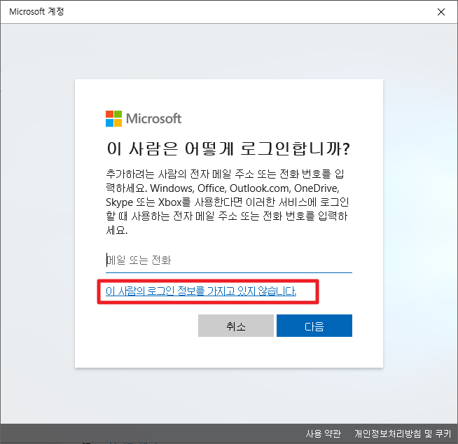 위의 방법까지는 모두들 쉽게 알 수 있습니다. 하지만, 여기에서부터 또다른 고민을 빠지게 됩니다. 바로 MS(Microsoft)계정이 필요한 걸까 라는 고민이죠. 먼저 답부터 드리면, 반드시 필요한 것은 아닙니다. 따라서 MS계정 없이 로그인 계정 추가 하는 방법으로 진행 하도록 하겠습니다. 그럼 다음 화면에서 [이 사람의 로그인 정보를 가지고 있지 않습니다]를 선택해 주시길 바랍니다.