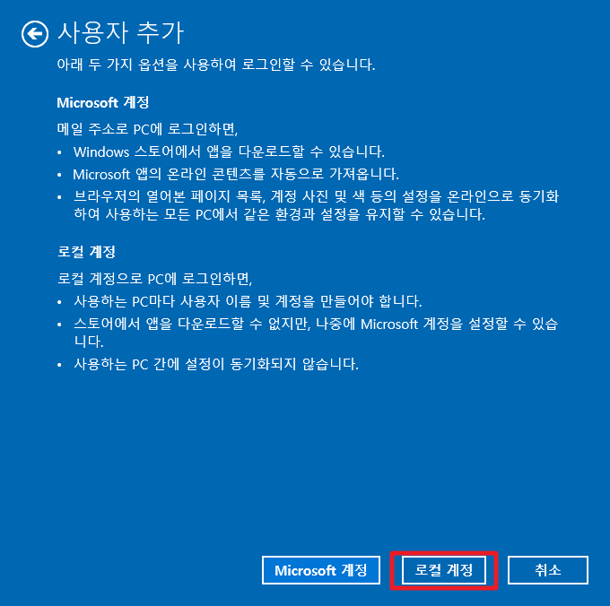 여기에서 하단에 [로컬 계정] 부분을 클릭해 주시길 바랍니다.