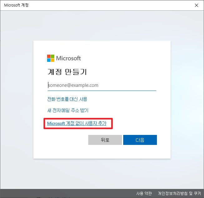 그럼 계정 만들기 화면이 나타날 것입니다. 이 때, [Microsoft 계정 없이 사용자 추가]를 클릭해 주세요.
