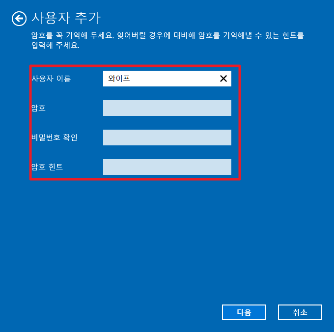 그럼 다음과 같이 사용자 이름 암호, 암호 힌트등에 대해서 입력을 해주시고, 다음을 눌려주세요.