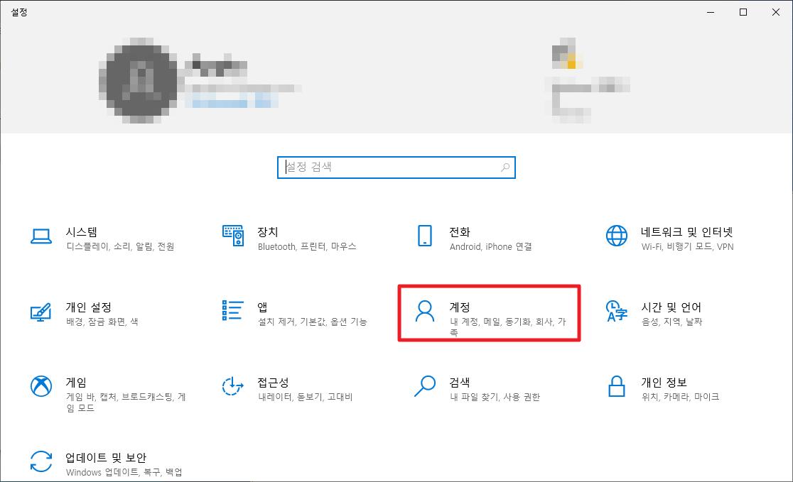그럼 다음과 같이 설정 메뉴가 보입니다. 여기에서 [계정]를 클릭해 주세요.
