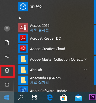 먼저, 삭제와 추가가 동일한 메뉴에서 이루어지기 때문에 로그인 계정 추가하는 부분을 하면서 삭제하는 부분도 같이 다루어 보도록 하겠습니다. 일단 윈도우 키를 눌려서, 메뉴를 활성화 해주시길 바랍니다. 그럼 좌측에 보이는 빨간 상자와 같이 설정 아이콘을 보입니다. 이 때 설정 아이콘을 클릭 해주세요.
