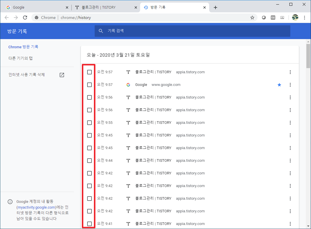그럼 [방문기록]메뉴로 들어오시면 다음과 같이 현재 제가 방문했던 기록들에 대해서 나열을 해주고 있습니다. 여기에서 날짜별로, 방문했던 사이트에 대해서 확인 가능합니다. 만약 방문기록에 대해서 부분적으로 삭제하길 원하신다면, 빨간 상자의 부분들, 즉 삭제하고자 하시는 부분(방문했던 사이트 정보)을 선택해주세요.