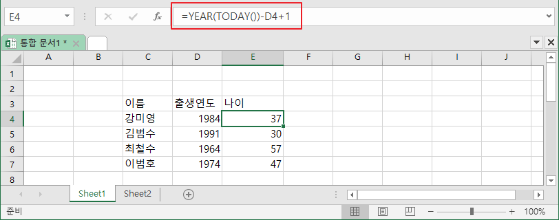 = YEAR(TODAY())-출생연도+1