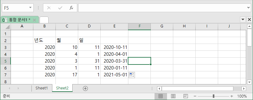 그럼 위의 함수를 바탕으로 한번 다음과 같이 적용해보도록 하겠습니다. 먼저 년도, 월 일의 컴럼에 각각 데이터를 입력했습니다.