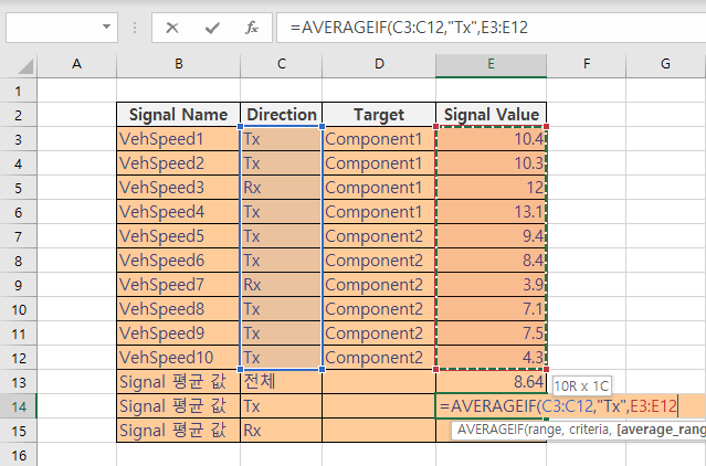 그럼 위에 셀 조건에서 Direction이 Tx, Rx의 부분에 대해 각각 평균을 구해보도록 하겠습니다. 먼저 각 해당하는 부분에 대해서 다음과 같이 함수를 적용해보도록 하겠습니다.