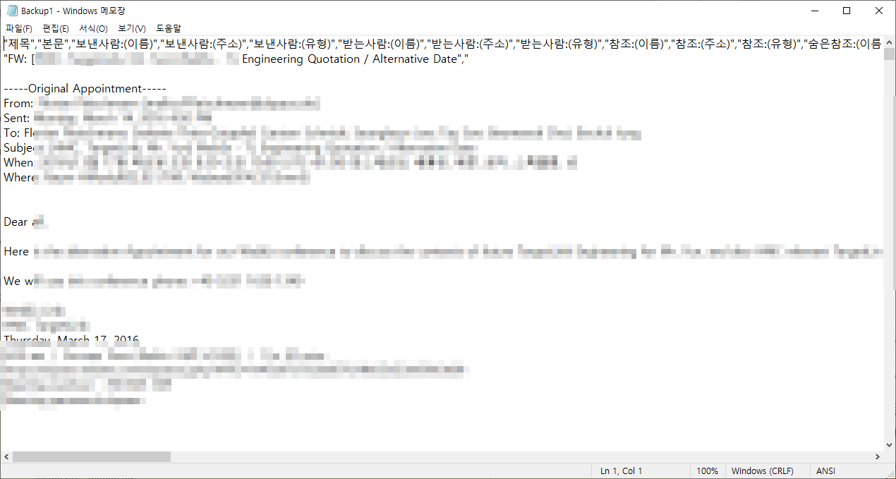 이런 형태로 CSV 파일 형태로 추출이 가능합니다. 생각보다 간단하지만, 많은 분들이 이 방법을 잘 모르는 것이 사실입니다. 그럼 이제는 아웃룩(Outlook) 데이터 파일 형태로 추출해보도록 하겠습니다.