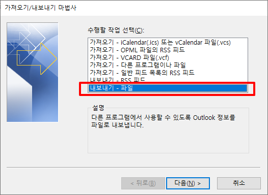 그럼 다음과 같이 가져오기/내보내기 마법사가 실행이 됩니다. 그럼 가장 하단에 있는 내보내기 - 파일을 선택하시고 [다음]버튼을 클릭해주시길 바랍니다.