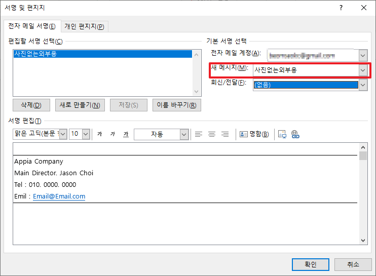 그리고 만약 새메일에 기본으로 등록되길 원하시다면 메뉴 상단 우측에 보이는 새 메시지 부분에 방금 작성한 부분을 선택해 주시면 됩니다.