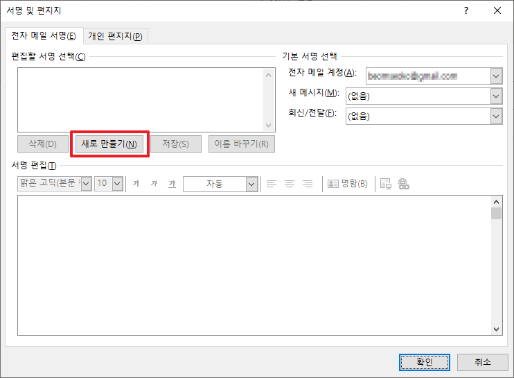 그럼 [서명 및 편지지]라는 메뉴가 나타납니다. 여기에서 [새로 만들기]를 누르셔서 서명을 추가해주겠습니다. 만약 아웃룩(Outlook)에 계정이 등록되어 있지 않다면 우측에 있는 기본 서명 선택 부분이 비활성화 될 것입니다. 참고해 주세요.