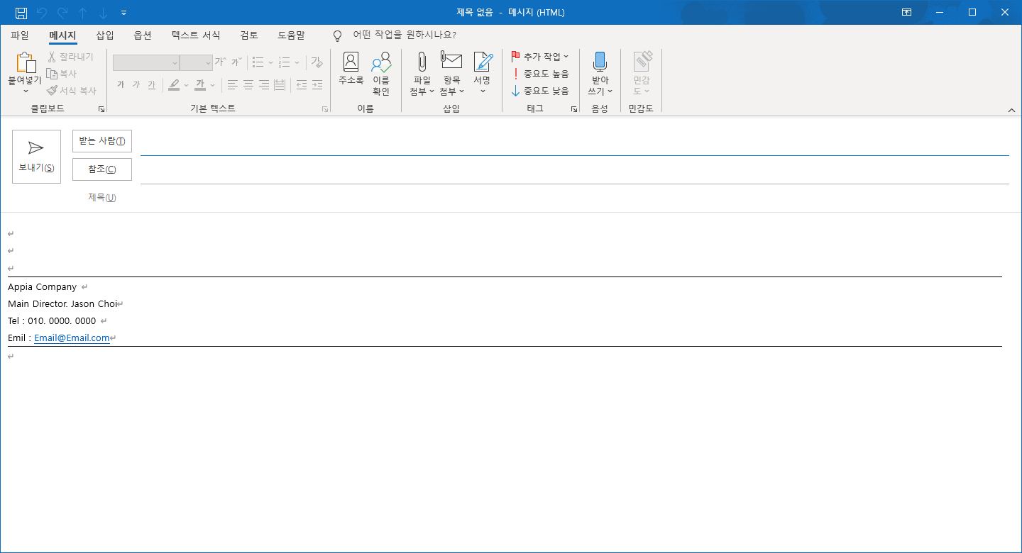 이와 같은 방법으로 서명을 추가했고, 자동으로 새 메시지에 서명이 추가되도록 해봤습니다. 만약에 수동으로 서명을 추가하시고자 하시다면 위에서 봤던 방법과 동일하게 상단 메뉴에서 서명을 누르시면 등록된 서명들을 다 선택할 수 있습니다.