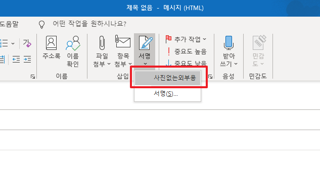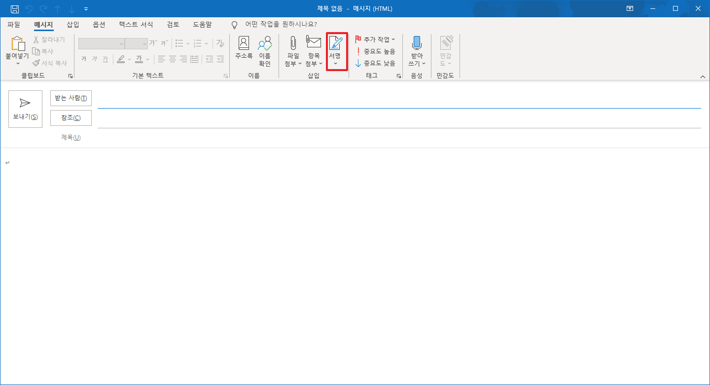 그럼 다음과 같이 새 메시지가 나타납니다. 여기에서 상단 중앙에 있는 [서명] 부분을 클릭해 주시길 바랍니다.