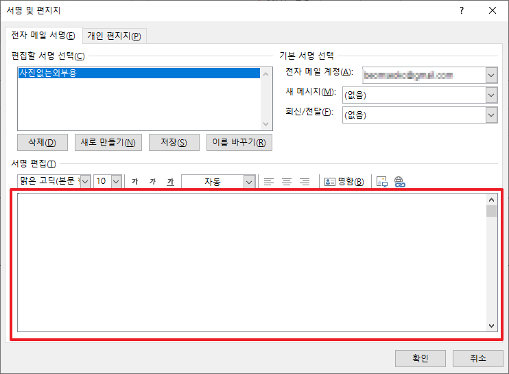 저의 경우 "사진 없는 외부용"이라는 이름으로 하나 등록 하도록 하겠습니다. 그럼 편질할 서명 선택 부분에 제가 입력했던 이름이 추가되었습니다. 밑에 빨간 상자로 보이는 서명 편집 부분을 클릭하셔서 원하시는 문구를 입력하시면 됩니다.