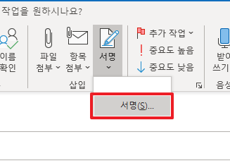 위에서 [서명] 부분을 클릭하면, 다음과 같이 나타납니다. 여기에서 [서명]의 하위 메뉴에 있는 [서명(S)...]을 클릭해주시길 바랍니다.