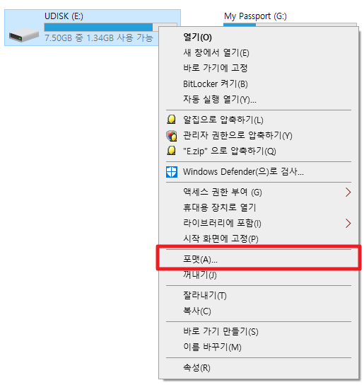 내컴퓨터에서 USB 드라이브를 선택하시고, 마우스 오른쪽 버튼을 눌러서 다음 메뉴에서 [포맷]을 눌러주시길 바랍니다. 사전에 데이터의 경우 백업을 해주시길 바랍니다.