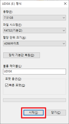 USB드라이버 포맷을 선택하실 때에 다음과 같은 메뉴에서 [시작]버튼을 눌러주시길 바랍니다. 물론, 빠른 포맷을 진행 하셔도 됩니다.