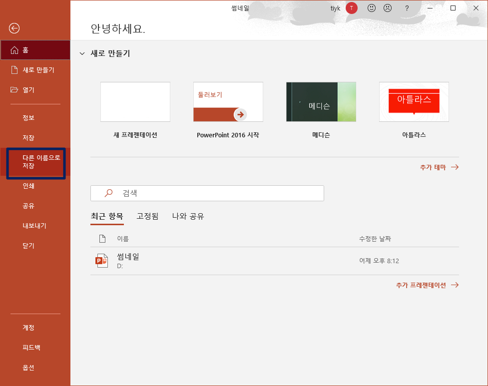 그런 후 다음과 같은 메뉴가 나타납니다. 좌측에 보이는 메뉴중에 [다른 이름으로 저장]부분을 클릭해 주시길 바랍니다.
