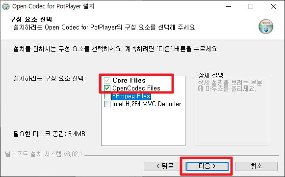 다음 화면에서 상단에 Core Files, OpenCodec Files부분은 기본 선택입니다. 하단에 2개는 선택을 안하셔도 됩니다. 그런 후에 [다음]부분을 누르셔서 진행하시면 됩니다.
