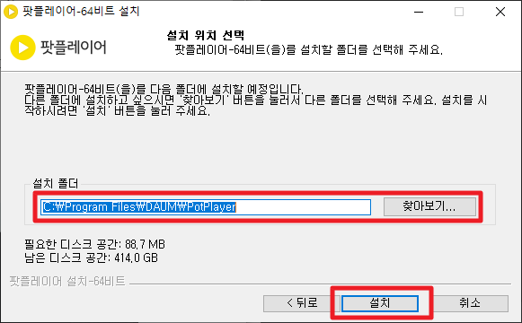 그런 후에 카카오(다음) 팟 플레이어가 설치된 경로 부분을 선택하시고, [설치]버튼을 클릭해 주시길 바랍니다.