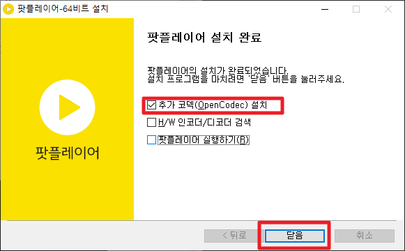 설치가 진행 완료되면 다음과 같이 카카오(다음) 팟 플레이어 설치 완료 화면이 나타납니다. 여기에서 아래의 빨간 상자와 같이 [추가 코덱(OpenCodec) 설치] 부분을 설치하시고, [닫음]버튼을 클릭해 주시길 바랍니다.