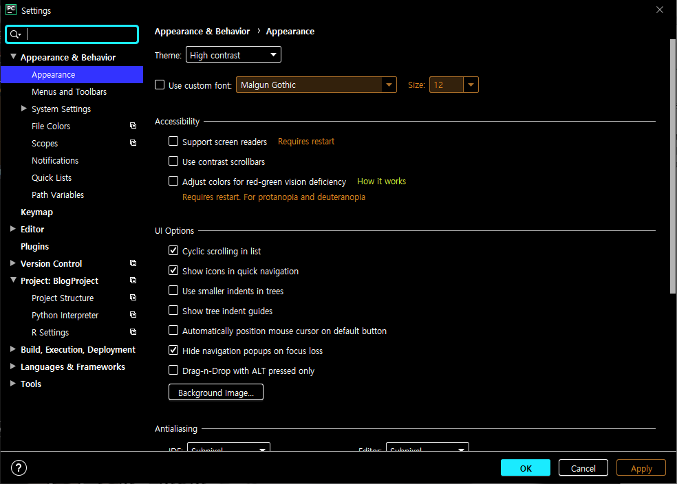 여기에서 테마를 부분을 원하시는 형태로 바꾸시면 됩니다. 저의 Pycharm (파이참)은 최신 버전이라 High contrast 부분이 있습니다. 저 개인적으로 선호하는 스타일입니다.