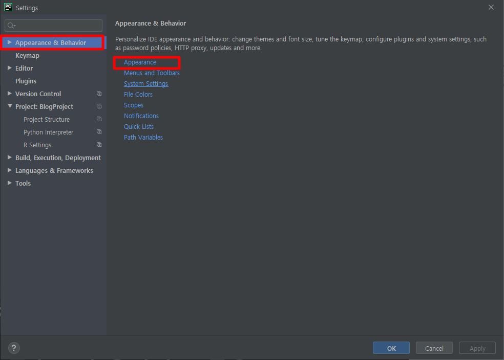 Settings 부분을 실행하시면 다음과 같은 화면이 나타납니다. 여기에서 다양한 세팅이 존재하지만, 테마만 바꾸실 예정이시면 여기에서 다음과 같이 [Appearance & Behavior]을 클릭해주시고, 그리고 나서 [Appearance]부분울 클릭해서 선택해 주시길 바랍니다.