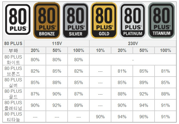 전원 및 케이스는 동일한 브랜드 제품을 구매하였습니다. 위의 제품들은 마이크로닉스 제품으로 케이스보다는 전원부에 조금 더 많은 돈을 투자하기로 했습니다. 그래서 처음에는 4만원대 케이스를 보았는데, 어차피 케이스는 PC의 성능보다는 본인의 취향 또는 보여지는 이미지이기 때문에 이 부분에 대해서는 과감하게 조금 더 저렴한 제품으로 선택하였습니다. 그 대신 전원부는 750W의 Bronze 제품을 선택하였습니다. 다음 등급표를 참고 부탁드립니다.