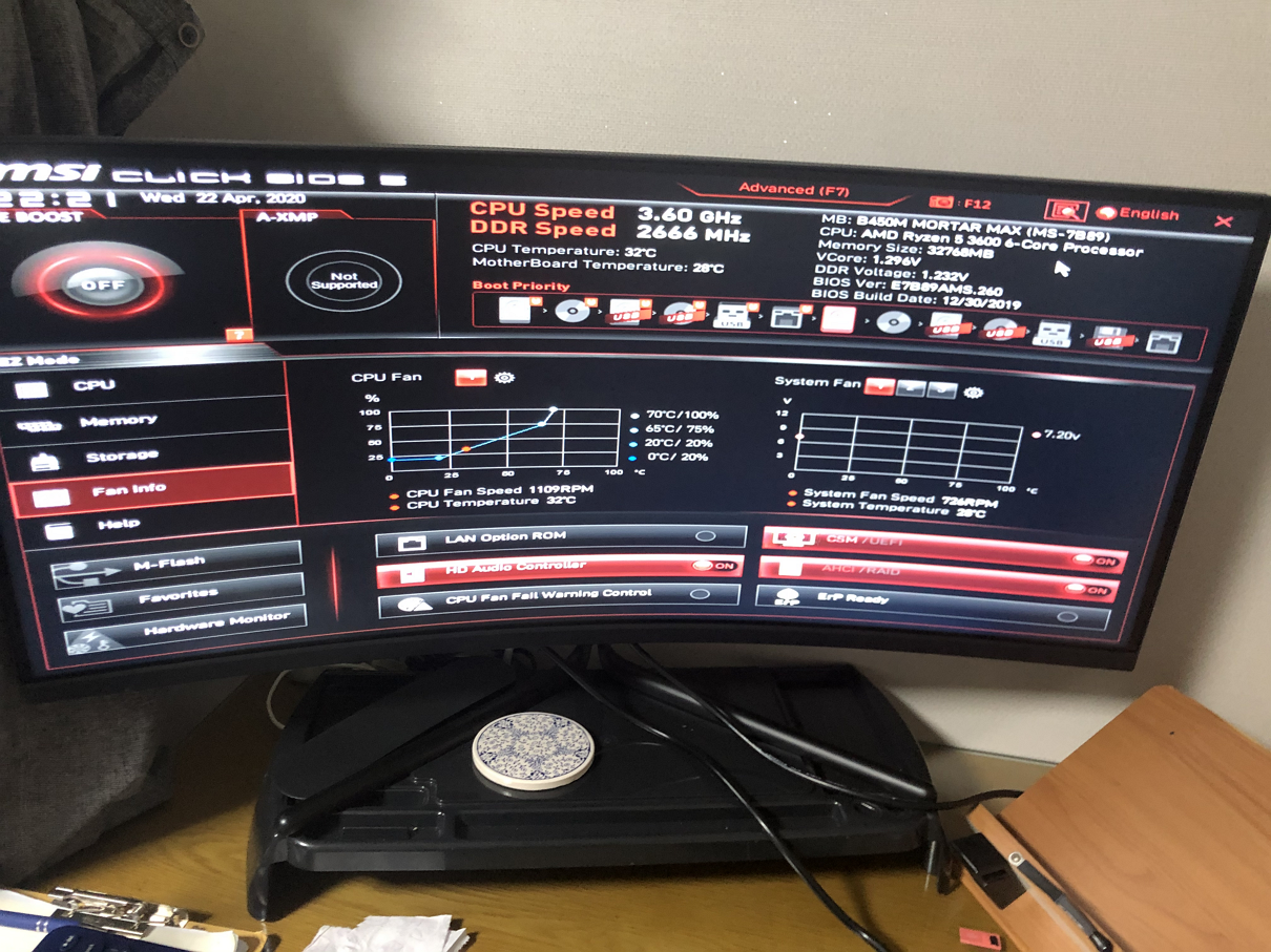 동작하여 처음 바이오스 화면을 보면 다음과 같이 정상동작을 하고 CPU 속도 온도등의 표시가 되는 것을 알 수 있습니다.