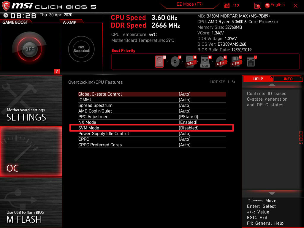 여기에서 보시면 다음과 같이 SVM Mode가 "Disabled" 되어 있는 것을 Enabled로 변경해주시면 됩니다.