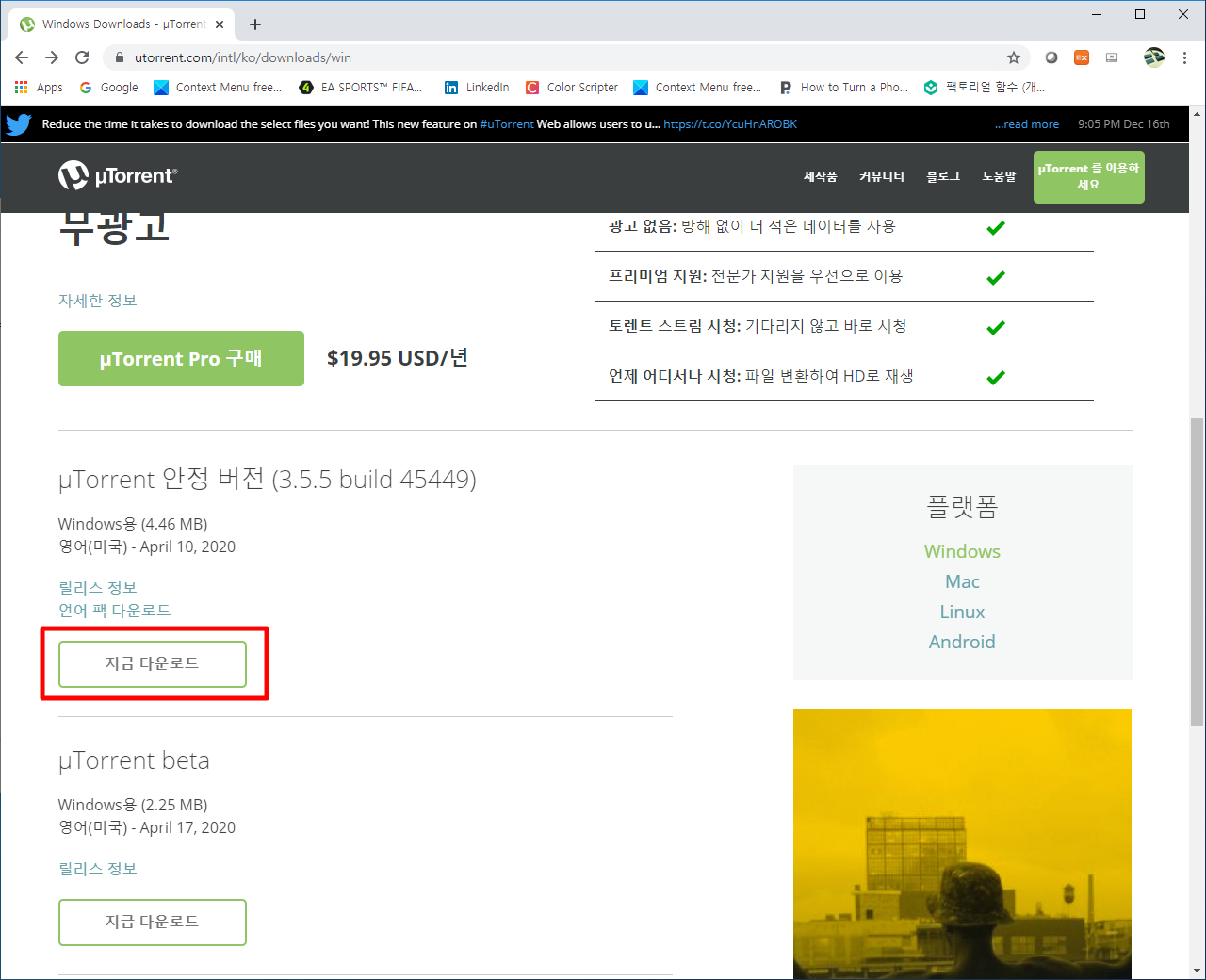처음 화면은 uTorrent Web버전을 광고 하고 있기 때문에, 관련해서 스크롤을 다운하여 uTorrent 안정 버전이라는 부분을 다음과 같이 "지금 다운로드"를 클릭하여 다운로드 받으셔야 합니다.